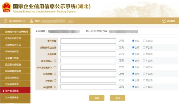 资产状况信息 进入资产状况信息页面 填写信息,点击保存 企业自行选择是否进行公示。